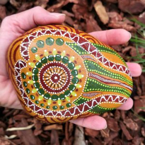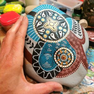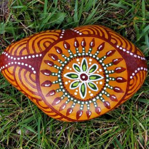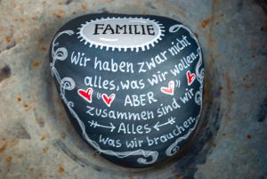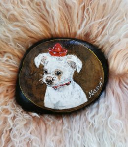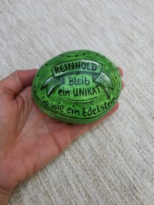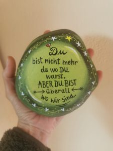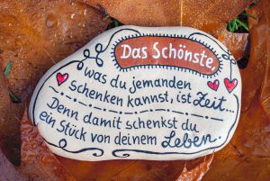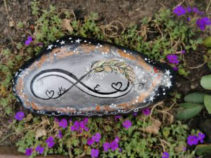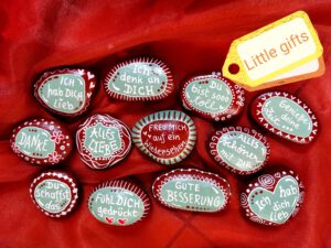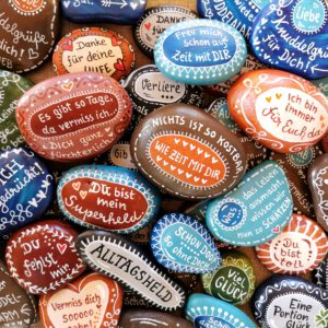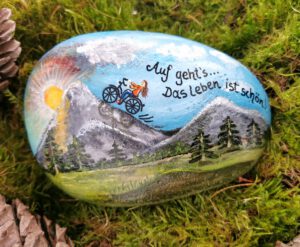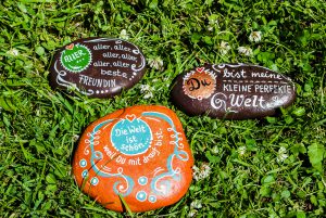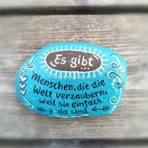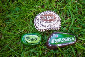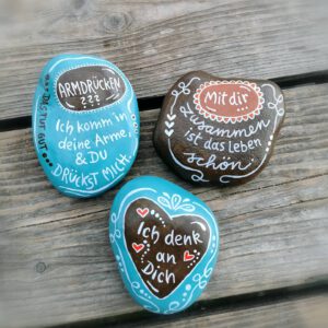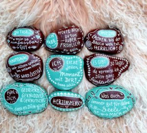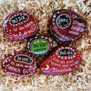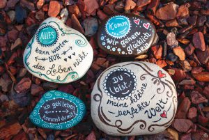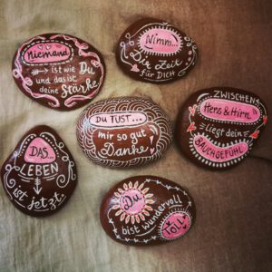 Das Bemalen von Steinen ist eine weitere große Leidenschaft. Jeder Stein ist ein Unikat und einzigartig in seiner Form und Größe. Er wird von mir als Glücks-, Energie- oder Schutzengelstein bemalt oder in Wort und Schrift künstlerisch „verzaubert“. Anschließend werden die Steine mit Lack versiegelt, was auch zu einer brillanten Farbentwicklung beiträgt. So wird jeder Stein zu einem ganz persönlichen Kunstwerk.